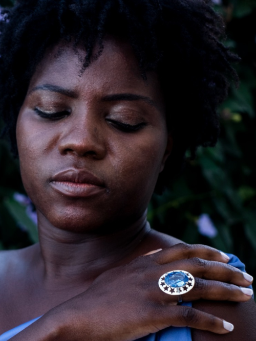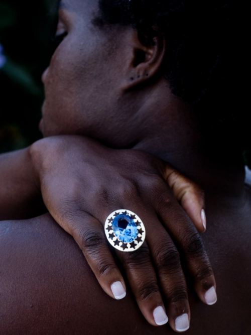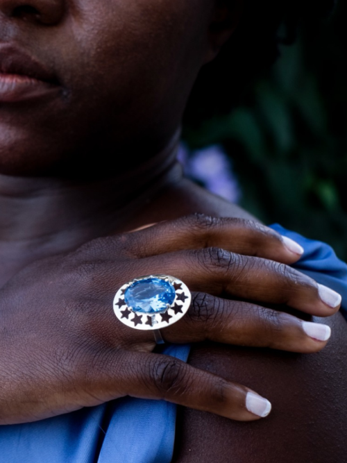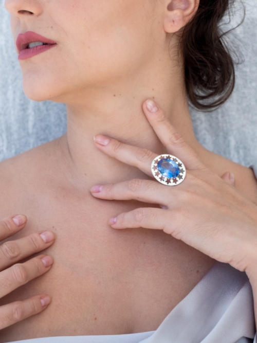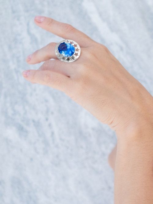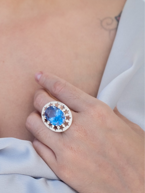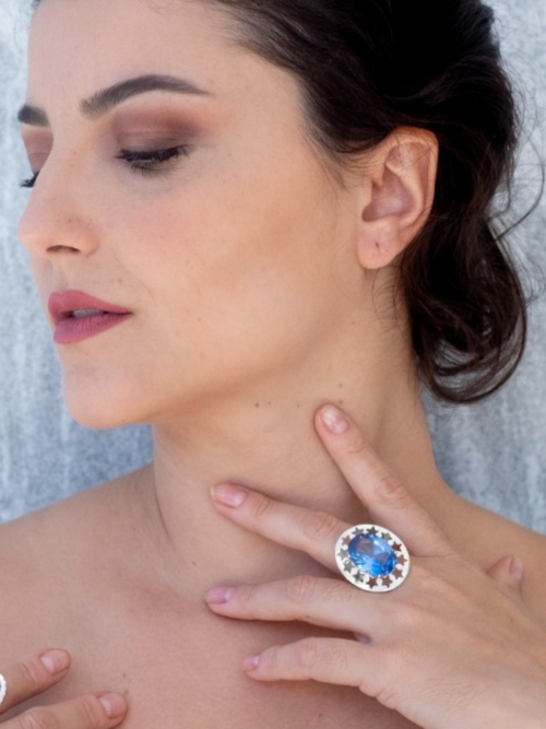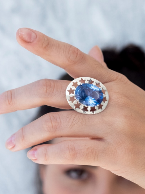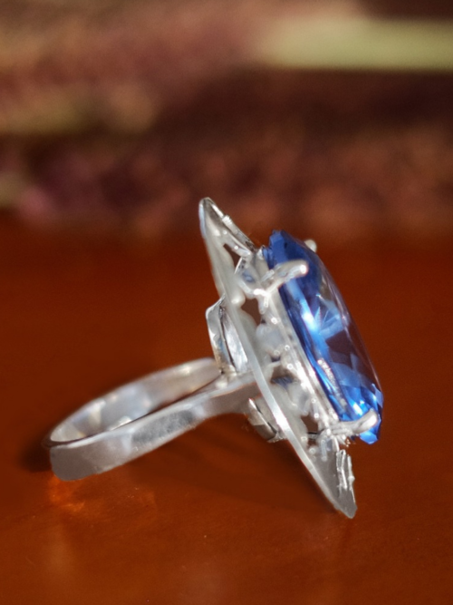 Anel em prata 925 Ar com uma grande pedra azul de zircônia.